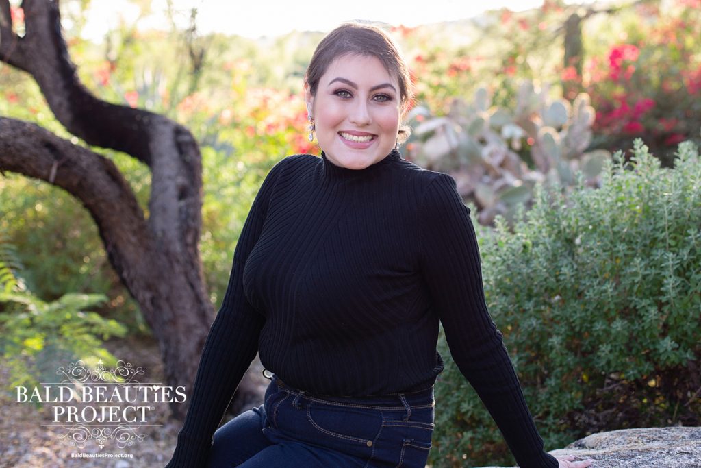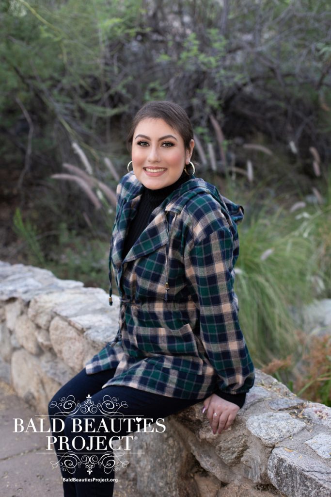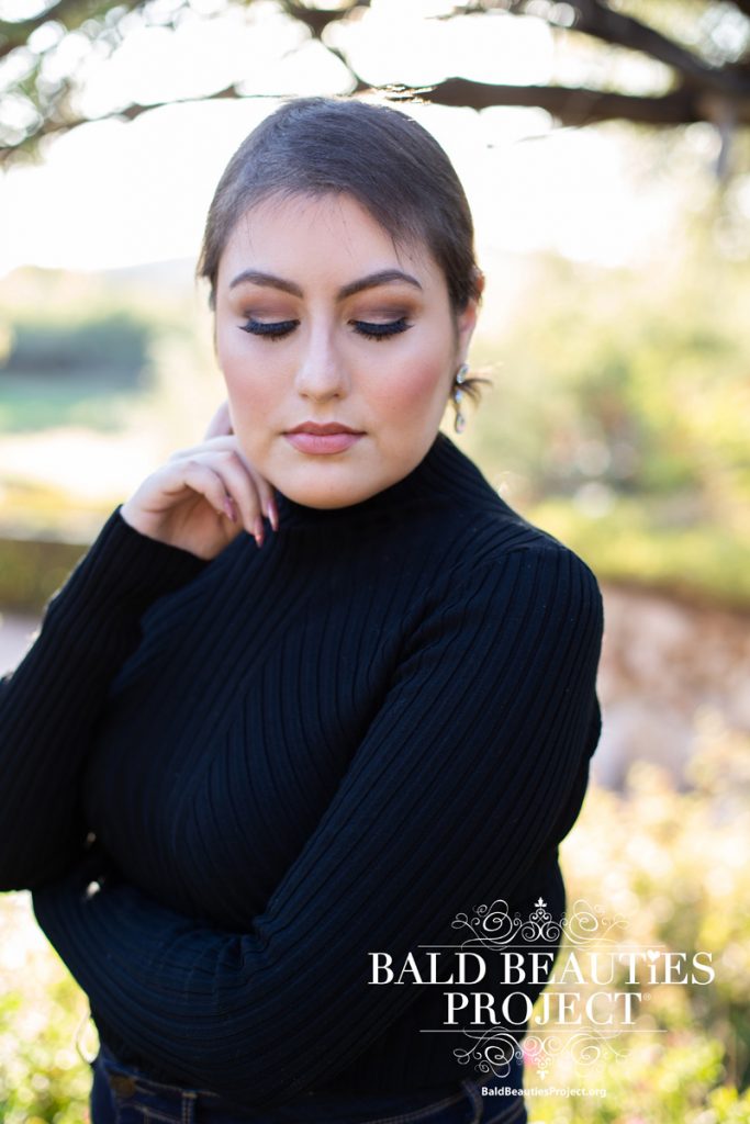 My name is Elisa, but if you’re feeling magical you can call me Elsa. I got the nickname when I worked at Party City for about two years. I loved working! I am 21 year old and I was diagnosed with T Cell Lymphoma on June 20, 2018. When I started to lose my hair I felt so ugly and like I wasn’t myself anymore. My hair was a big part of my personality. I would dye my hair and cut it in different styles and I would love to spiral curl it. Once I was in treatment I didn’t want visitors because I didn’t want anyone to see me, this also made me depressed. One day my nurses were helping me to change my feeding tube and my scarf had fallen off. The nurses told me how pretty my bone structure was and that I had a great bald head. This helped to give me confidence and not feel as though I had to hide my head behind a scarf each day. Having my picture taken provided me with more self confidence as my inner beauty shined through.